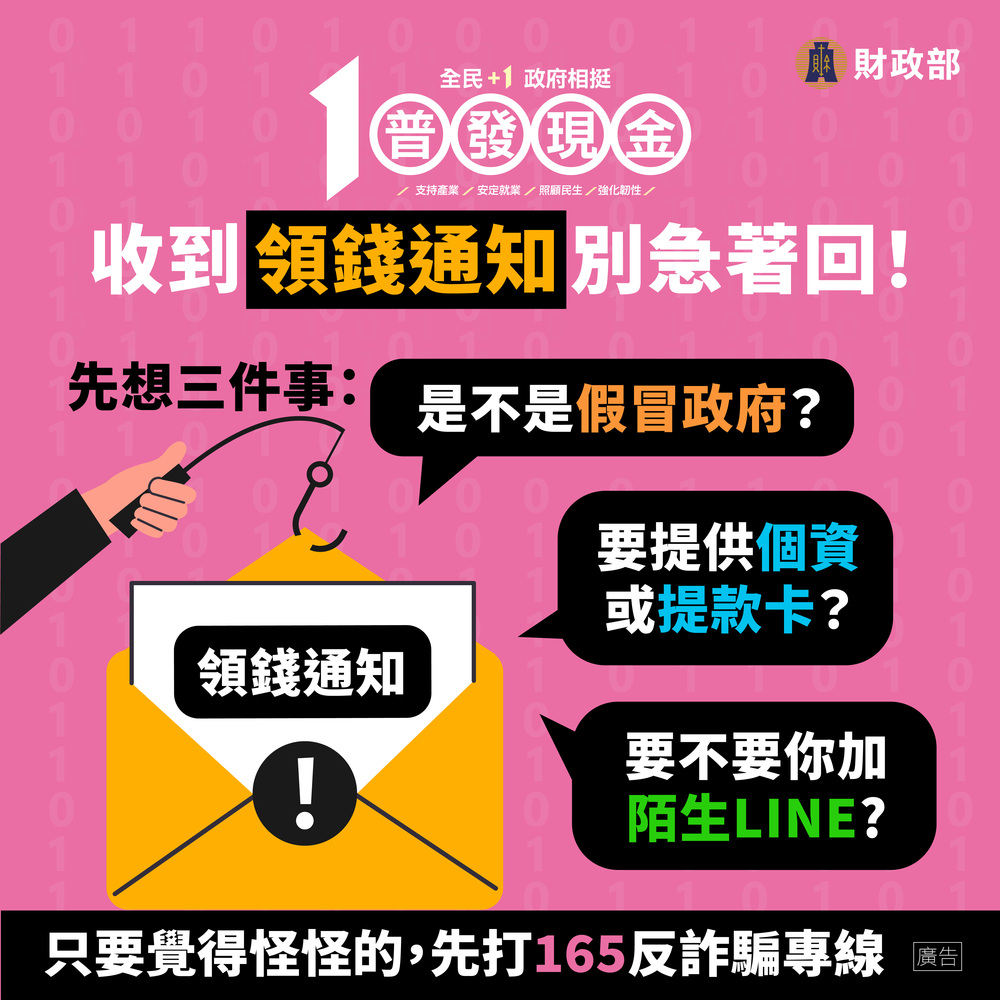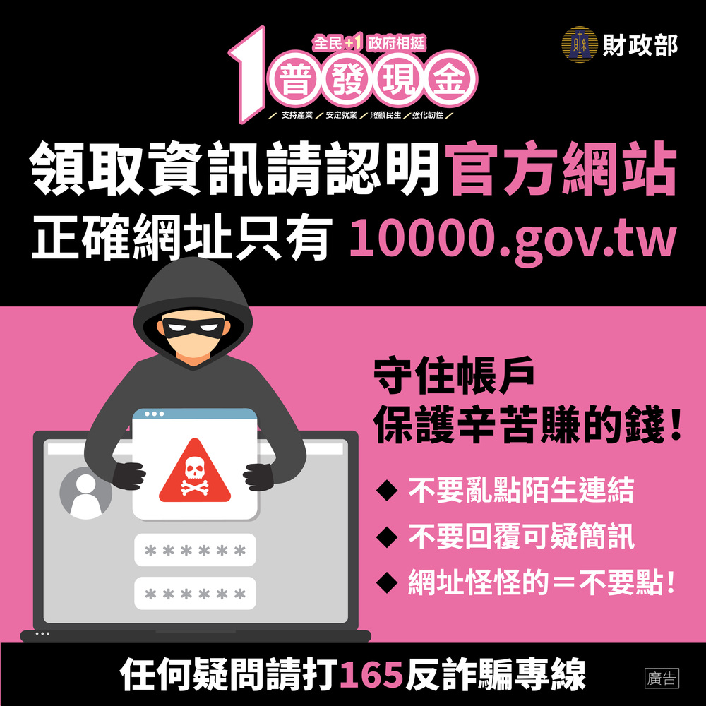 【注意事項】政府絕不會主動發送簡訊或電子郵件通知民眾領錢或登記,一旦遇到可疑網站或訊息,請立即撥打 165 反詐專線 ,全民共同防堵詐騙事件發生。提醒全國民眾「防詐四不」原則: